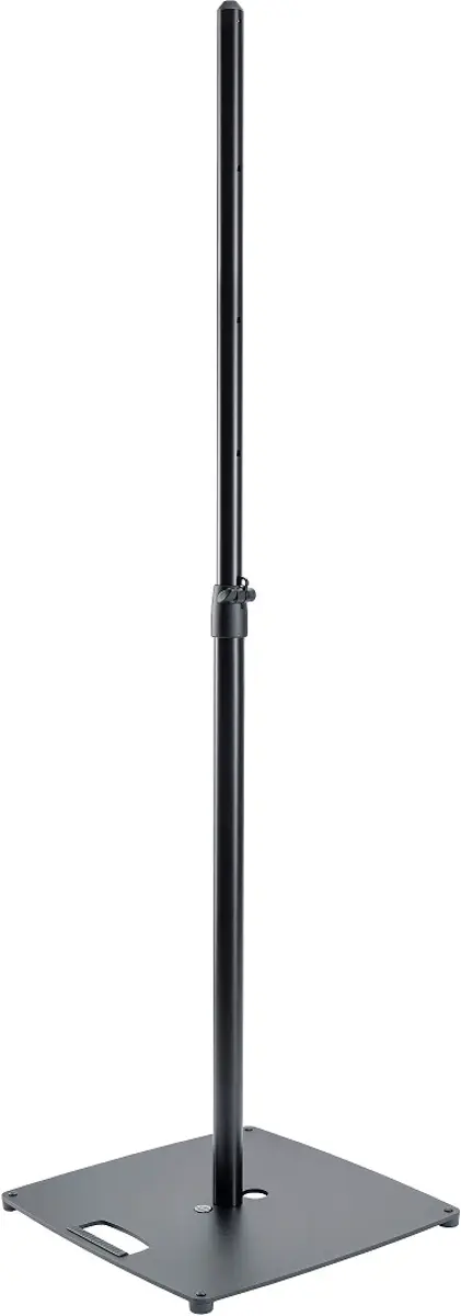 Attractive speaker stand with flat steel plate (489 x 489 mm), useful carrying handle and cable management. The stand is ideal for use where space is at a premium. The height is fixed with a safety hook and secured with a low-noise, backlash-free clamping screw. The slim design of the clamp enables space-saving transportation and ensures a stylish appearance. The usable height is between 1,110 and 1,810 mm and is adjusted in 4 steps of 175 mm. The maximum load capacity when fully extended is 35 kg.