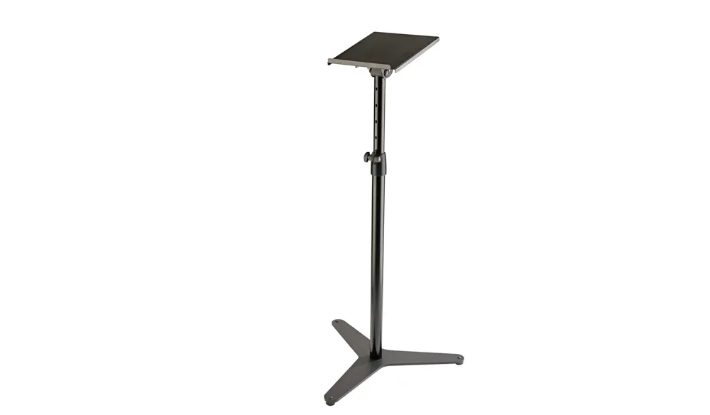 The modern studio monitor stand with a tiltable tray and a metal tripod base provides for stability and functionality. The three felt coverde studs ensure noise filtration. The adjustments for the monitor tray include a 12.5° angle and 1.771" in depth. The stop angle of the tray provides additional safety. The height is adjusted by a clamping lever and ranges from 31.496 to 51.181". The gradual height adjustment to the desired positions takes place in 1.968" intervals.