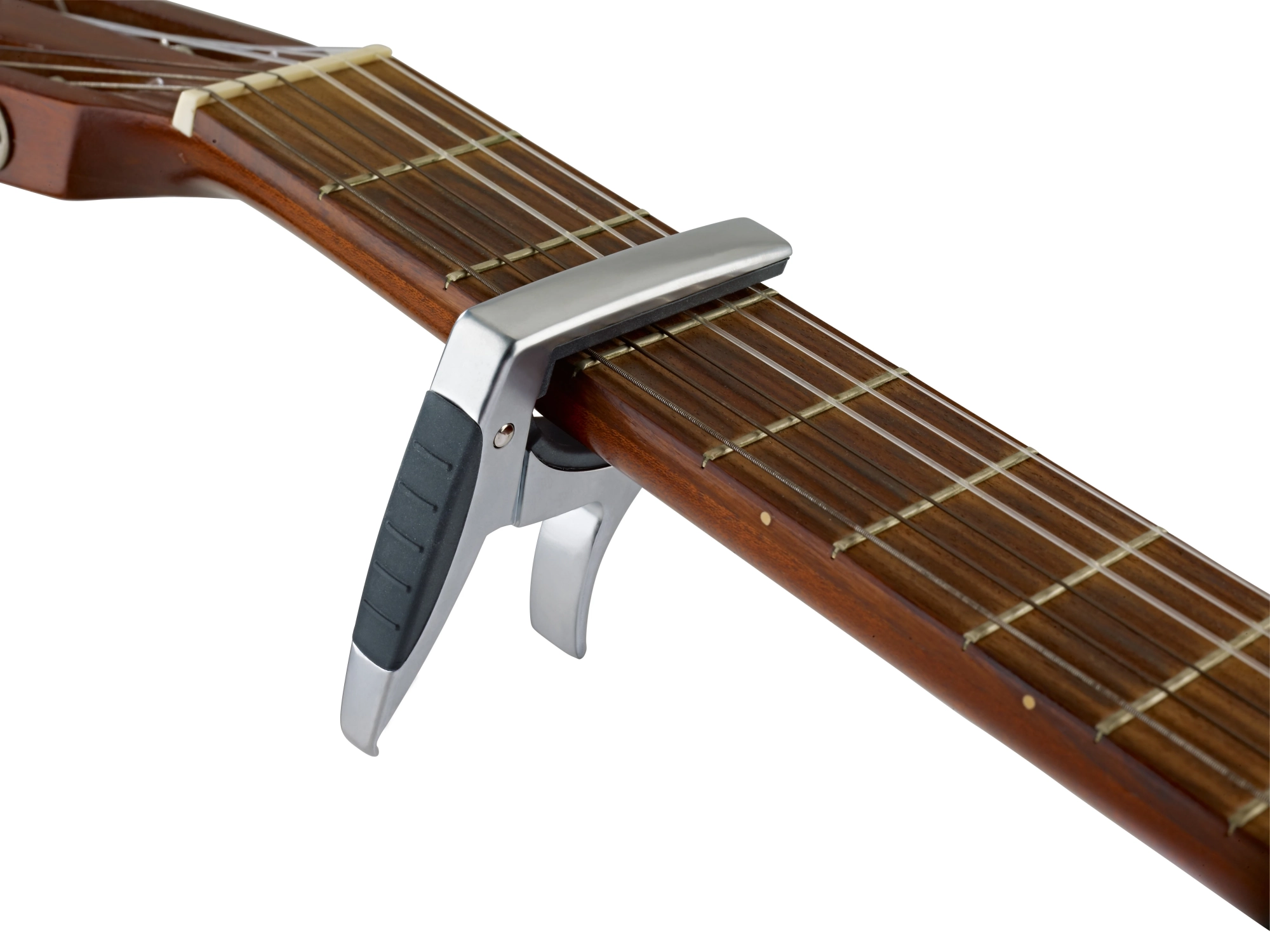 Professional capo for classical guitars with flat fretboards. The clamping mechanism can be operated quickly and easily with just one hand. Light construction, matt chrome-plated finish. The rubber padding secures the capo to the fretboard and prevents slipping.