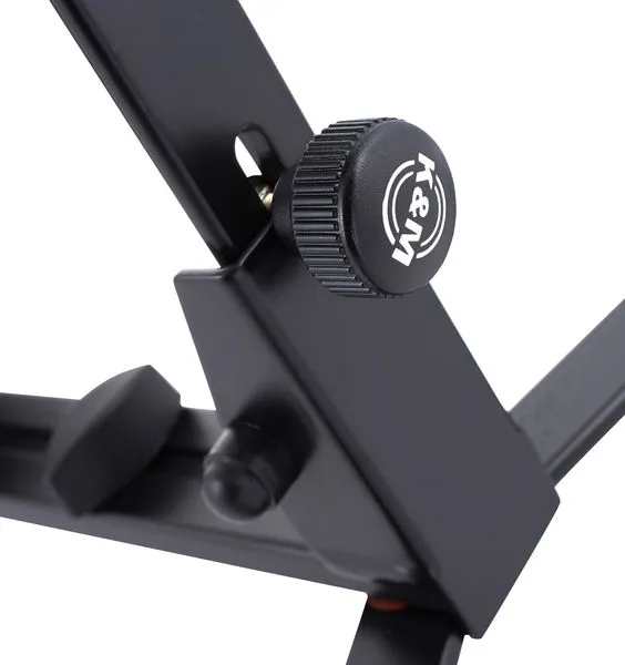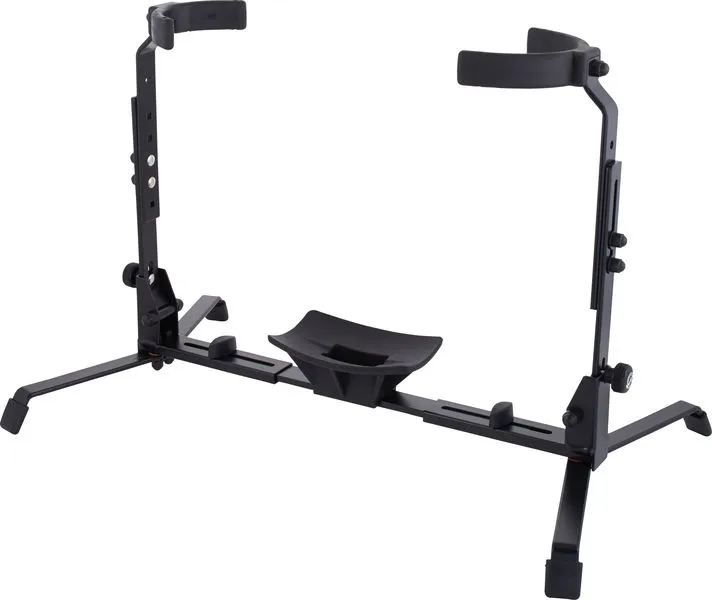 Collapsible stand for German and English tubas. The brackets are completely covered with a synthetic coating and can be adjusted in height and width to fit each instrument. The instrument is spring-mounted on the plastic support shell and thus protected against damage.