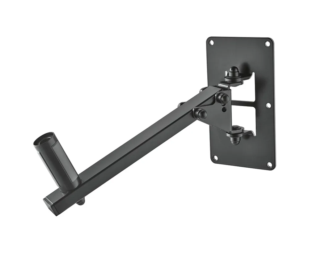 Robust wall mount for holding speakers with flange socket up to 25 kg. The swivel range is continuously adjustable up to 120°. The tilt can be fixed in three steps with 0°, -12.5° and -25°. A patented expanding mandrel ensures a wobble- and vibration-free fit of the speaker. The solid steel construction and durable powder coating ensure long-lasting use.