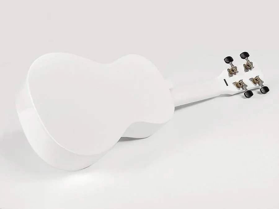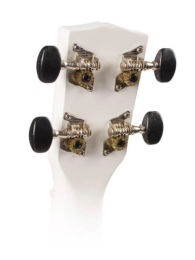 Soprano ukulele, wood, with guitar machine heads and bag, white