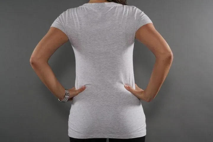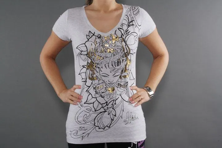 La Ink T-shirt with V-neck. Print on the front with silver foil details. 95% cotton, 5% elastane. Gray, small.