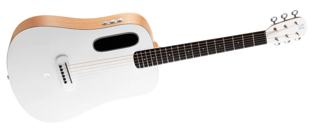 The elegant design with frost-white top and back, paired with walnut sides provides a stylish aesthetic and a luxurious gig bag with neck support is included.