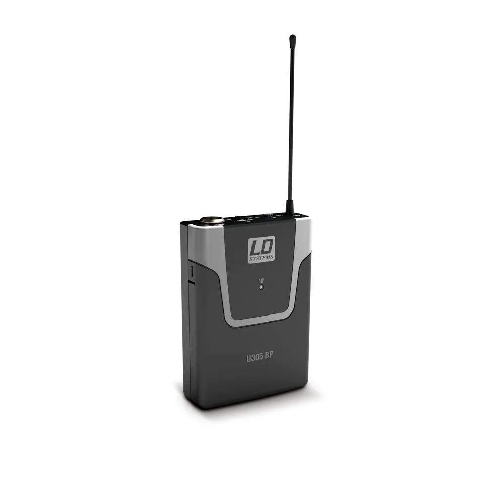 U300 transmitters have a 10 mW output and an operating time of 10 hours on two AA batteries. The handheld microphone’s frequency response ranges from 55 Hz to 16 kHz. With a lower cut-off frequency of 25 Hz, the bodypack is also suitable for transmitting 5-string bass guitars with a deep H string. The bodypack’s input level can be adjusted to both active and passive guitars and basses over three levels. The power switch features a handy standby mode for temporary muting. The U300 receiver is fitted with a bright LCD channel display, an LED chain for displaying audio signal strength and both a balanced XLR and an unbalanced 6.35 mm audio output. The audio output can also be switched to instrument level for directly connecting to guitar and bass amplifiers.