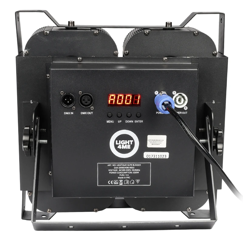 Light4Me 4Lite Blinder can stand or be easily installed on trusses or lighting ramps, as well as combined into assemblies using the mounting bracket attached to the device. Such installation allows you to obtain the desired angle of light and, as a result, illuminate the desired surface. On the back of the blinder there are powercon power sockets, including a special "pass on" type output, allowing direct transmission of voltage between devices. In addition, 3-pin XLR sockets are also available, allowing you to operate the reflector using the DMX protocol. The control panel consists of a digital display and four buttons, guaranteeing easy configuration and operation. With its help, we can choose one of the four operating modes we are interested in: