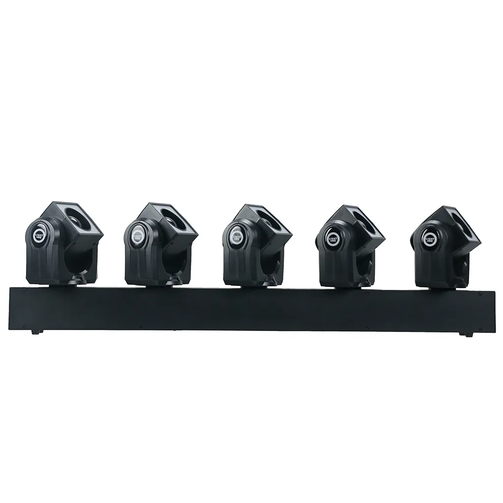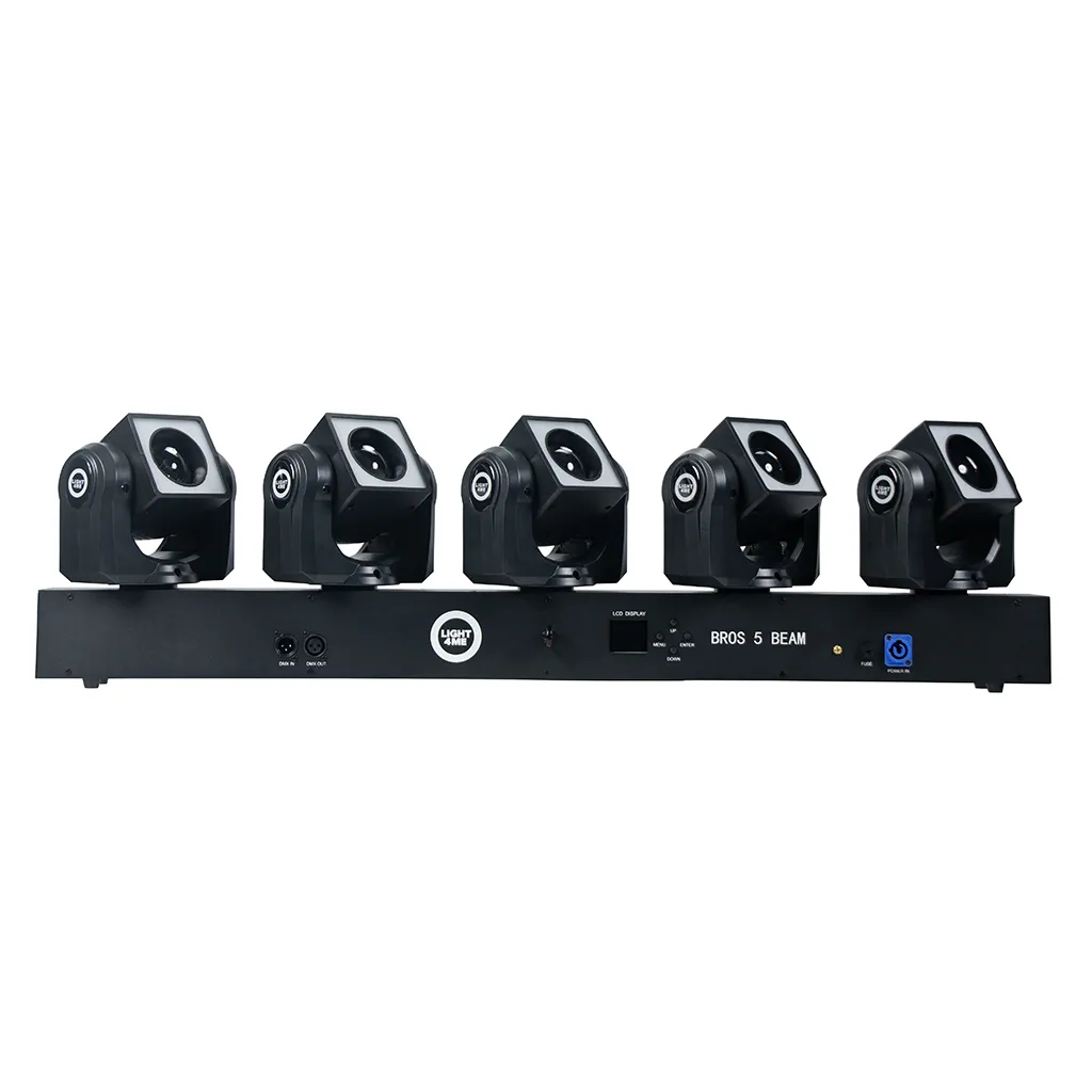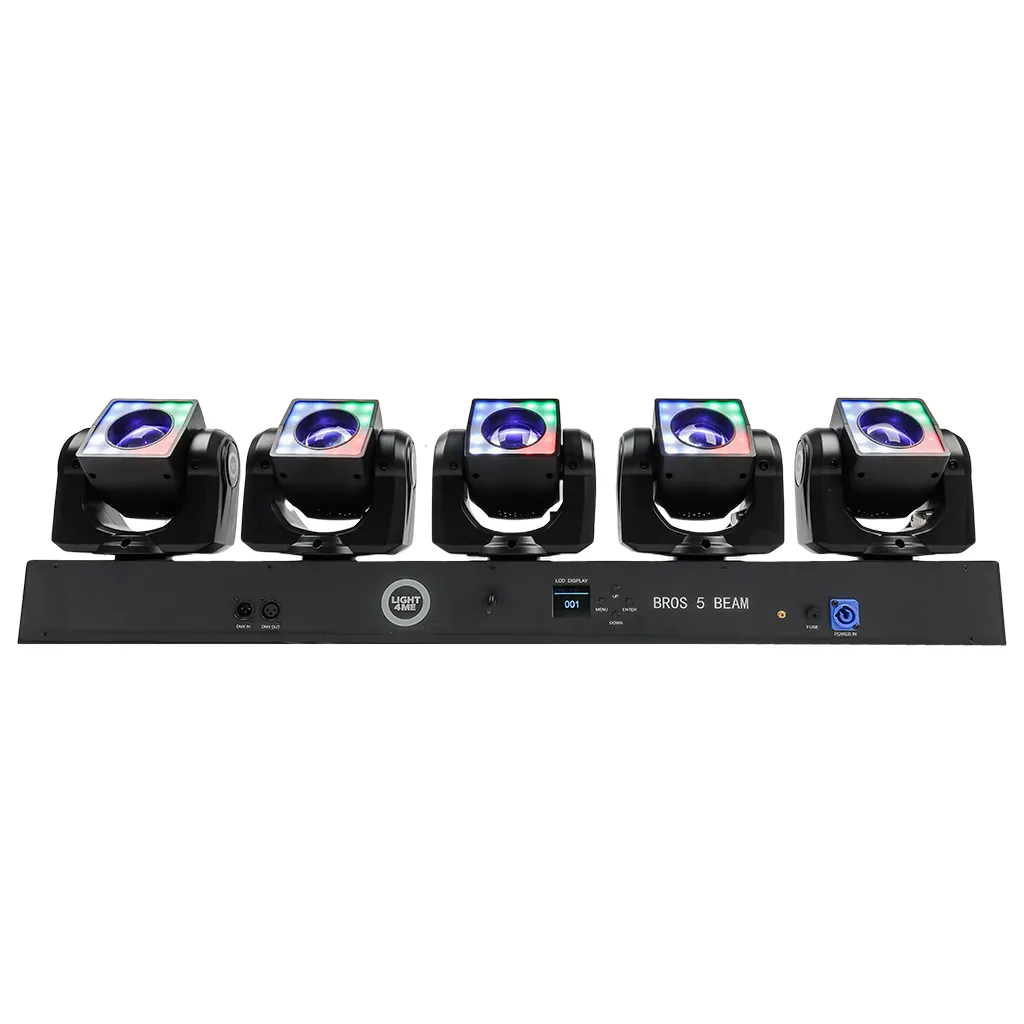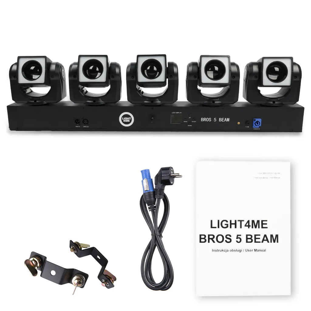Light4me Bros 5 Beam is a professional LED light effect, whose light sources are 5 moving heads each equipped with 40W RGBW main diodes and 24 0.2W RGB background diodes! The operation of each head, including the main diode effects and background effects, can be controlled separately using the DMX (Pixel Control) protocol. LED lighting works great on music stages, during performances and shows, in dance clubs and discos, as well as dynamic lighting for wedding bands and mobile DJs .