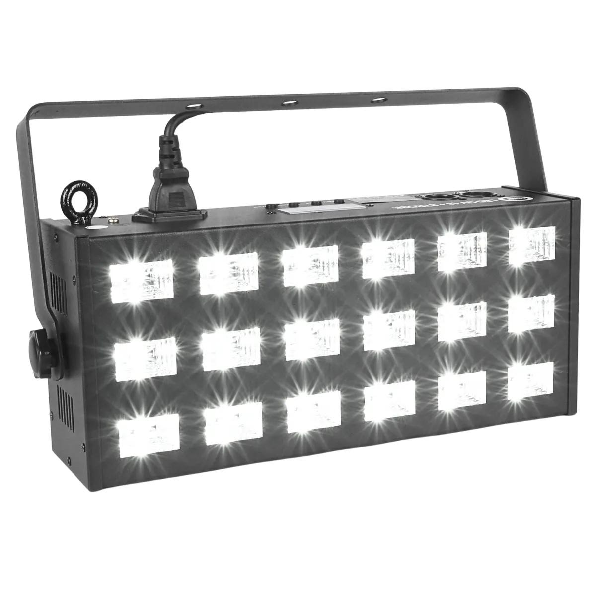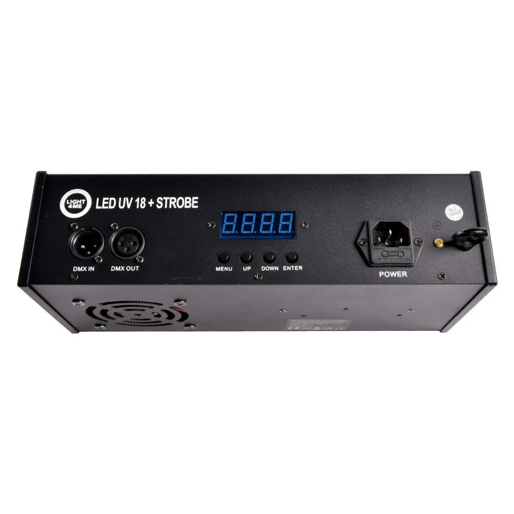 LIGHT4ME LED UV 18 + STROBE is a powerful stage lighting unit equipped with 18 3-watt UV LEDs and white light capability. It is ideal for use in pubs, restaurants, dance clubs, and discos, where UV light creates fluorescent effects, especially on white surfaces.
