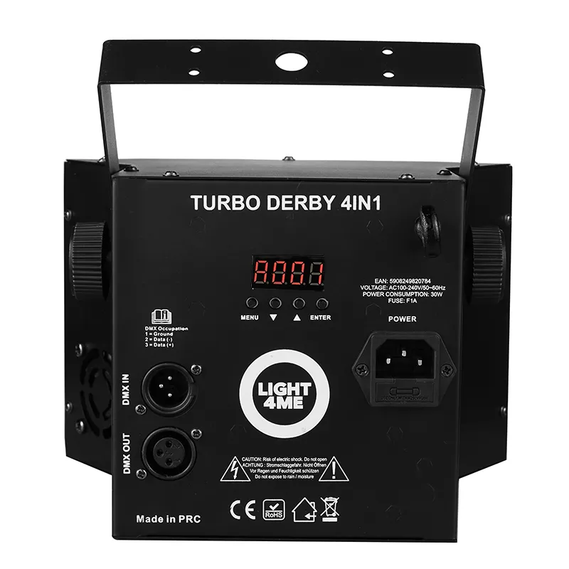 LIGHT4ME TURBO DERBY 4IN1 is designed for maximum user convenience. Equipped with a control panel with LED display and four buttons, it allows easy and intuitive setting of preferred parameters. The option to turn off and reverse the orientation of the display are additional features that make it easier to use the device in changing conditions. In addition, a factory reset feature allows you to quickly return to the default settings, which is extremely useful when reconfiguring for various events. The included sturdy mounting bracket allows quick and convenient mounting of the device on trusses and lighting ramps .
