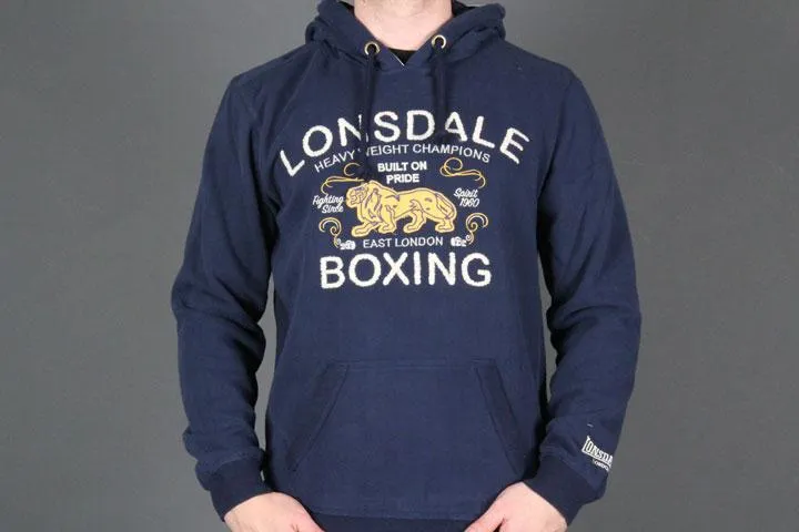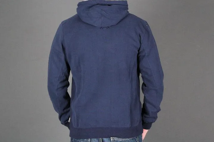 Navy blue slim fit hoodie, Embroidery and appliqué on chest, 80% cotton/20% polyester, Kangaroo pocket on front. Men's, large.