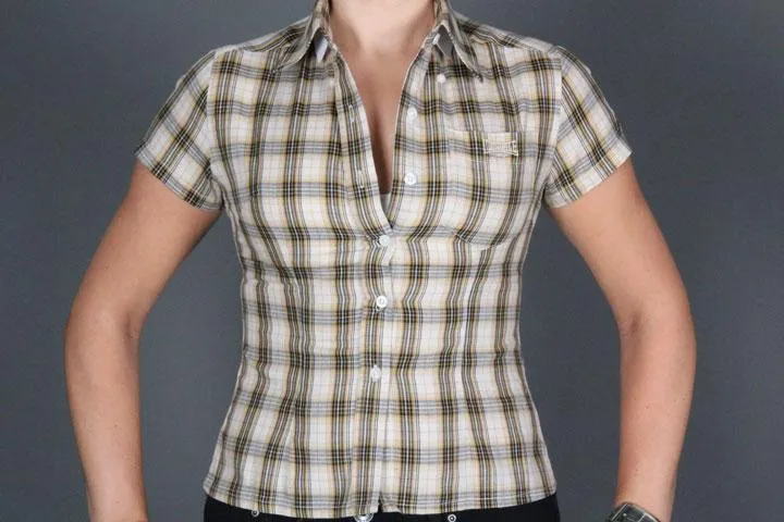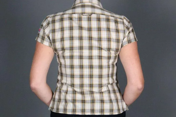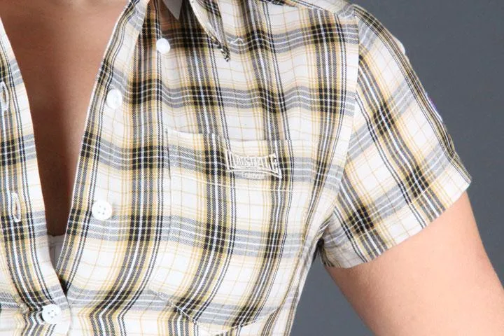 Short sleeve shirt with embroidered Lonsdale logo on the chest pocket. 55% cotton/ 45% polyester. Ladies, Sand 8352, large.