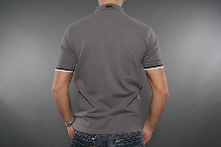 Gray polo shirt with embroidery on the sleeve and on the collar. Application on the chest. 100% cotton. 210 gr/m2. Men's, medium.