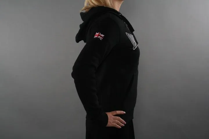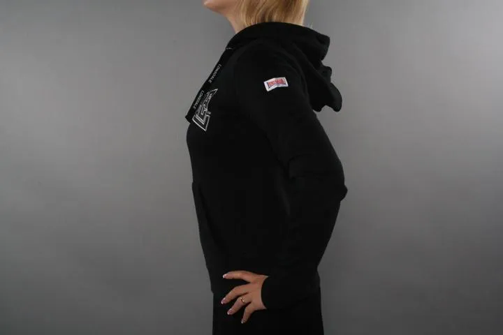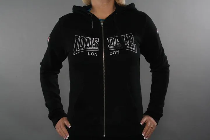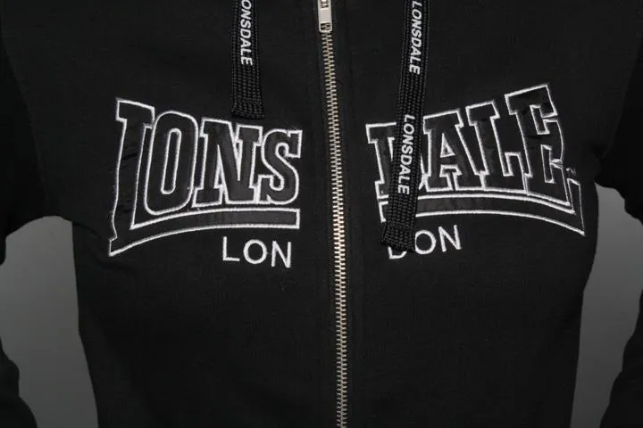 Lonsdale's classic zip-up hoodie. Large embroidery on the chest. Thick, soft and of the best quality. 80% cotton, 20% polyester. 300gr/m2. Ladies, black, XL.