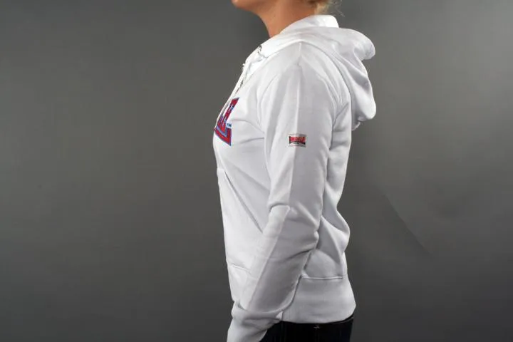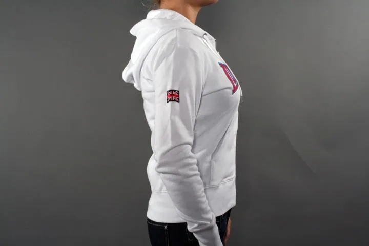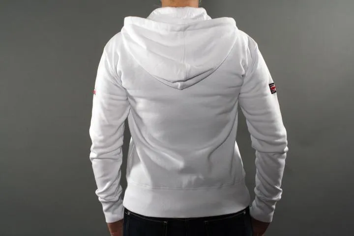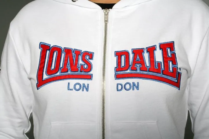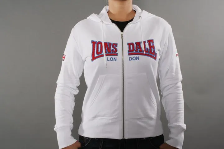 Lonsdale's classic zip-up hoodie. Large embroidery on the chest. Thick, soft and of the best quality. 80% cotton, 20% polyester. 300gr/m2. Ladies, white, medium.