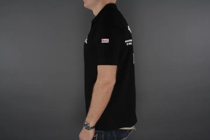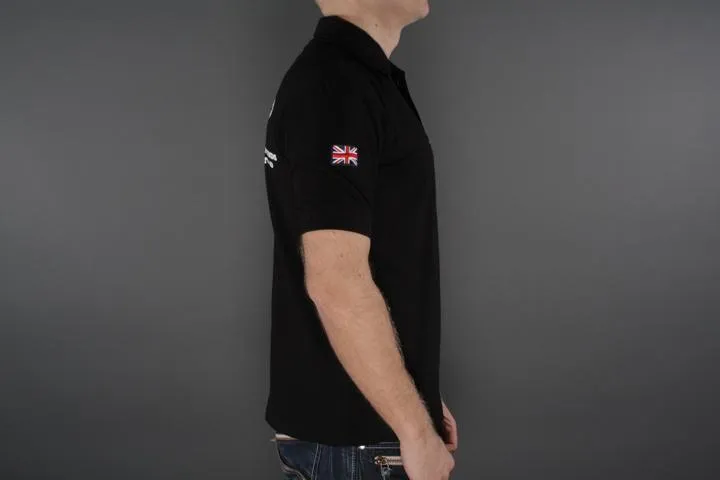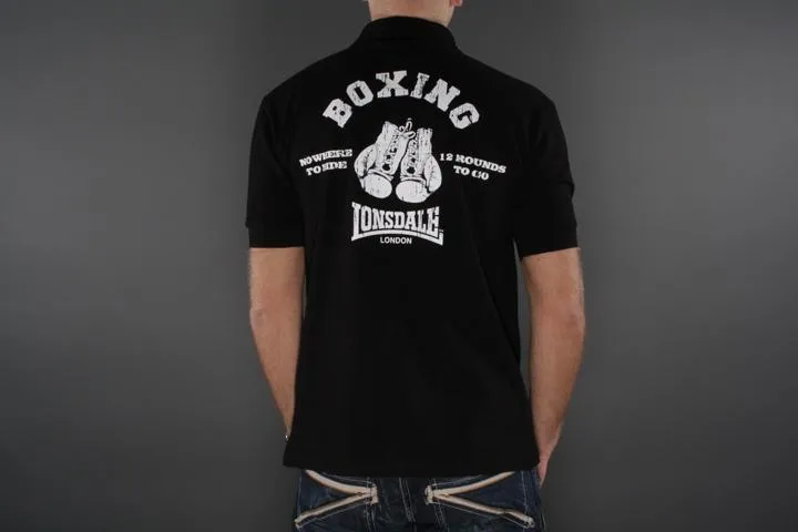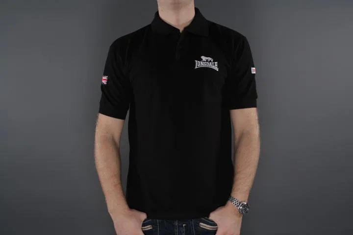 Short sleeve polo shirt with small embroidered logo on the chest. Large print on the back Small Lonsdale Logo on one sleeve and Union Jack on the other. 100% cotton. Men's, small, black.