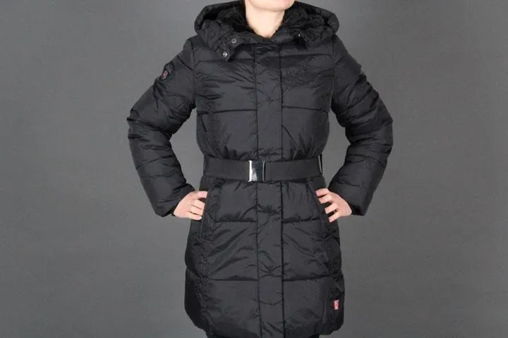Padded jacket with hood, Winter coat, very warm, 100% nylon, Pink tartan lining, one inside pocket, Zip and flap with press studs, Soft black faux fur in the hood, Ribbed around cuffs, Deep side pockets, Vintage embroidery on chest, Emblem on right sleeve, Regular size. Ladies, black, small.