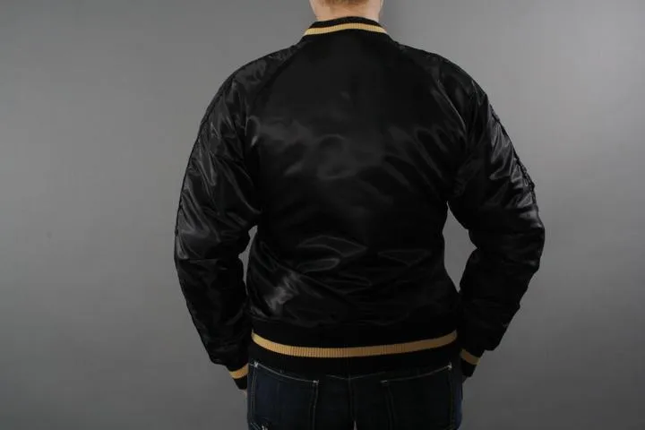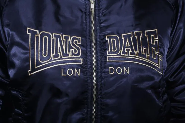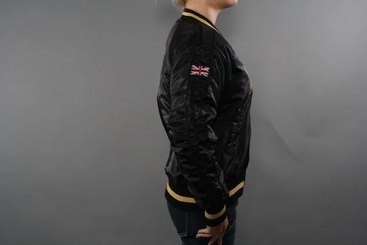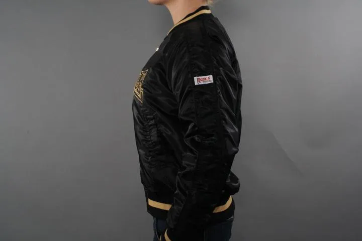 Sporty college jacket with zipper and embroidery on the chest in yellow. Union jack on one sleeve and lonsdale brand on the other. Pockets on the front and inner pocket. 100% nylon. Suitable for mild winter, fall and spring. Women, black, small.