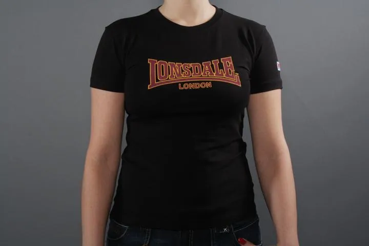 Classic short sleeve t-shirt with print on the chest. 95% cotton, 5% spandex. women's, Black, medium.
