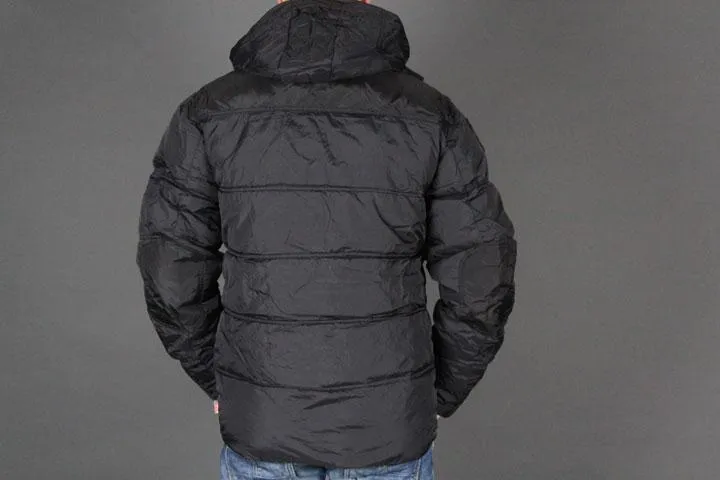 Warm winter jacket for men, 100% polyamide, lining and padding 100% polyester, Embroidered logo on chest, Emblem on right sleeve, Stand-up collar, Detachable hood with velcro, Ribbed around collar and cuffs, Chest pockets with press studs, Side pockets with press studs and zipper, Lion embroidered on hood, Elbow patches, Tartan lining, 2 zip pockets inside. Male, black, medium.