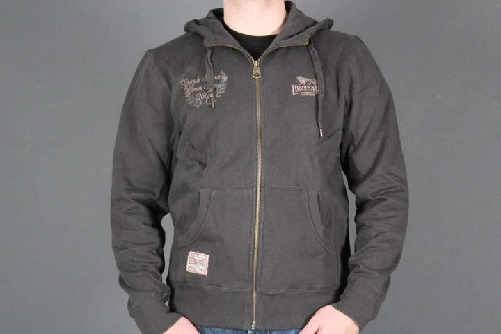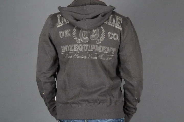 Slim fit hoodie with zipper. Embroidery on each side of the chest and print on the back. Pockets on the front. 100% cotton. Men's, gray, XL.