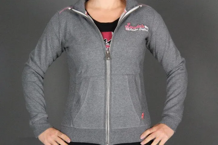 Vintage double layer application, embroidery on back & front, kangaroo pocket & stand-up collar. 80% cotton, 20% polyester. Women's, small. Ash Grey.