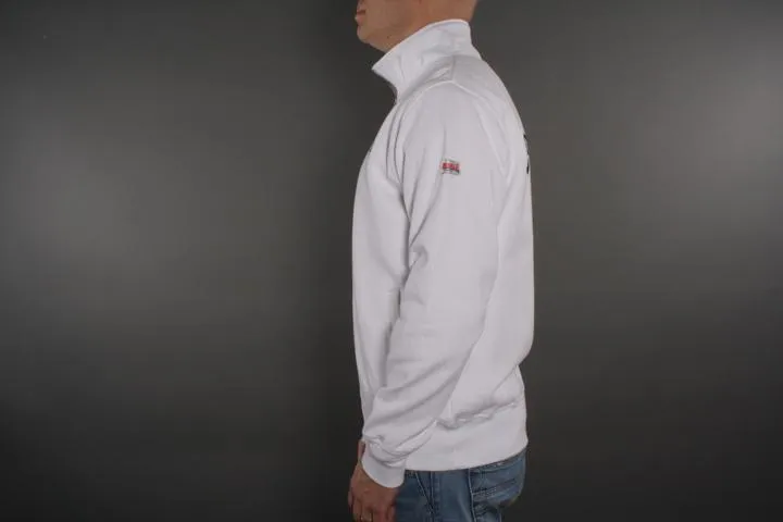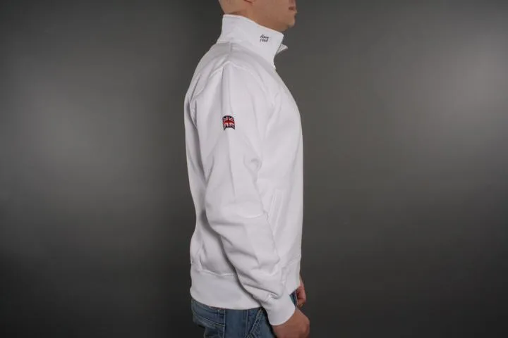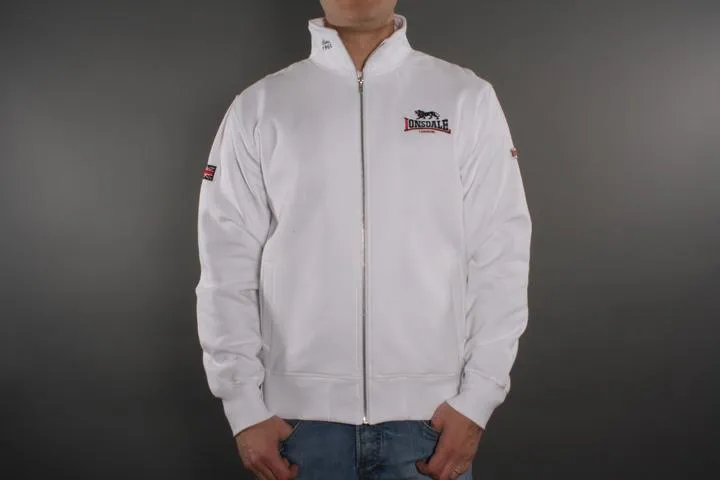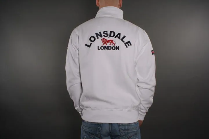 Sweatshirt with zipper. Embroidered Lonsdale logo on chest and larger embroidered logo on back. “Since 1960” embroidered on the collar. Small Lonsdale badge on one sleeve and Union Jack on the other. 67% cotton, 33% polyester. Men's, white, small.