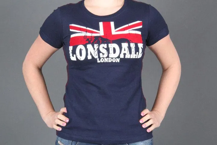Navy blue t-shirt with red and white print on the chest. 100% cotton. Women's, navy blue, small.