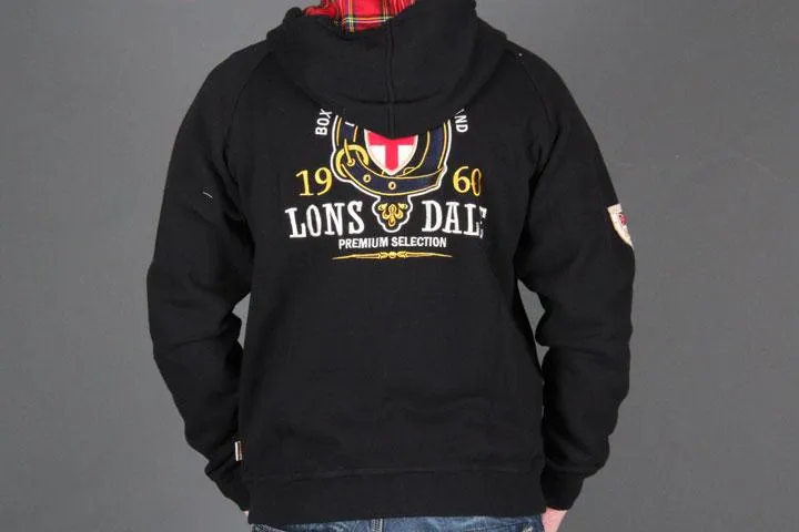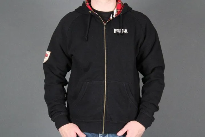Sweatshirt with zipper and hood. Tartan pattern in the hood. Lonsdale logo embroidered on the chest. Great britain application on one sleeve and large embroidery/application on the back. Slim fit. 100% polyester. Men's, black, Small.