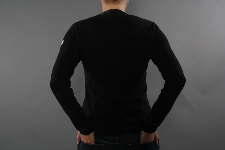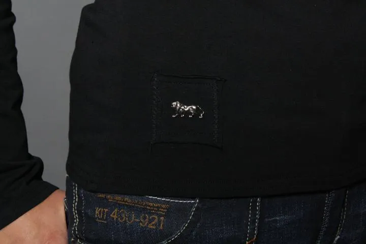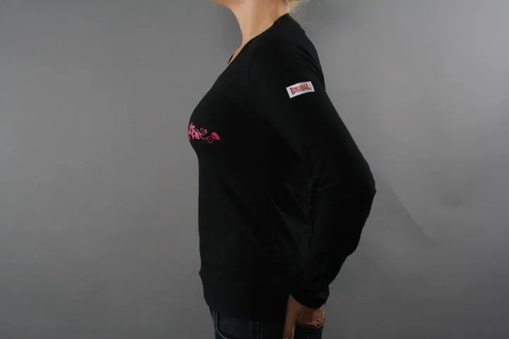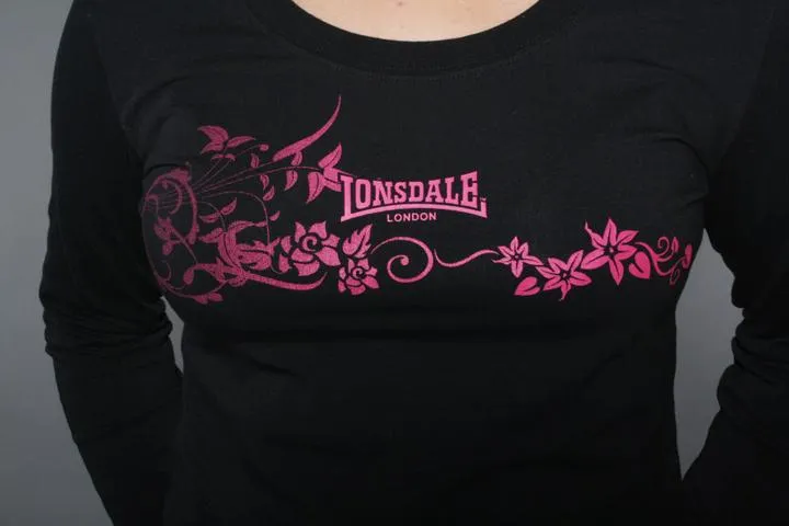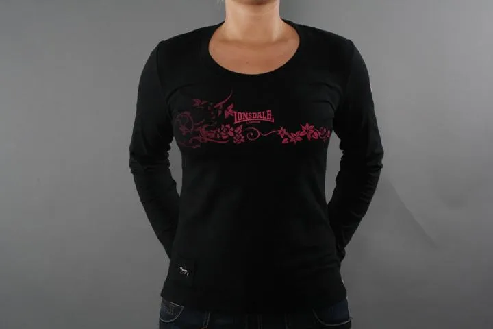 Feminine long sleeve t-shirt with print on the chest. Metal lion on fabric application. 95% cotton, 5% elastane. Women's, black, XS.