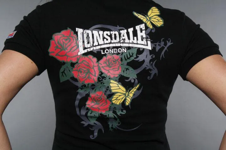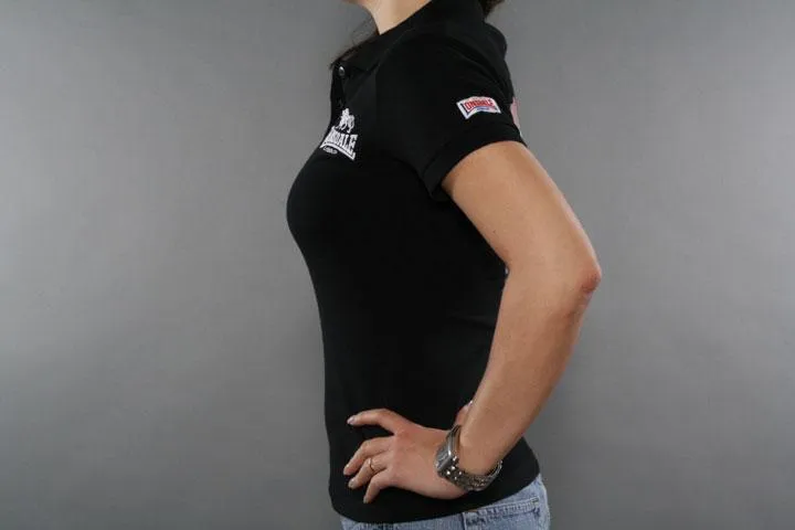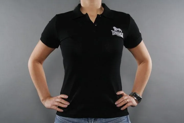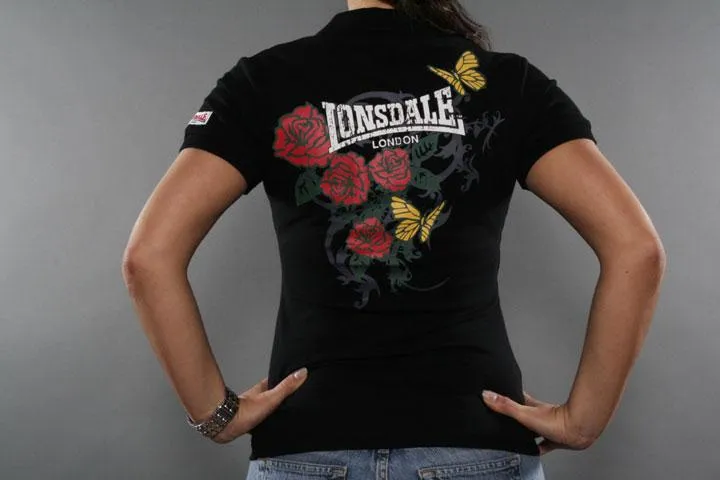 Ladies polo with floral print on back and embroidery on front. Material: 95% cotton, 5% elasthan. Wonen's, black, medium (38)