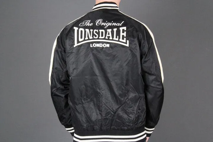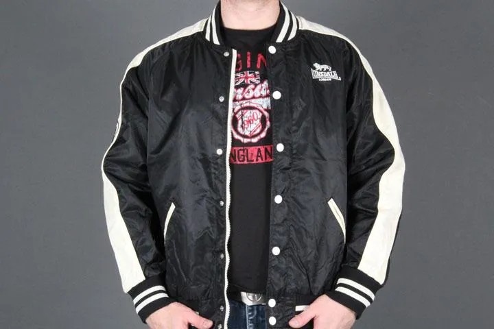 Baseball jacket with Lonsdale logo embroidered on the chest. 60 embroidered on one sleeve and The Original logo embroidered on the back. Zipper and buttoning. Inner pocket and 2 pockets on the front. 100% polyamide and 100% cotton inside. Large.