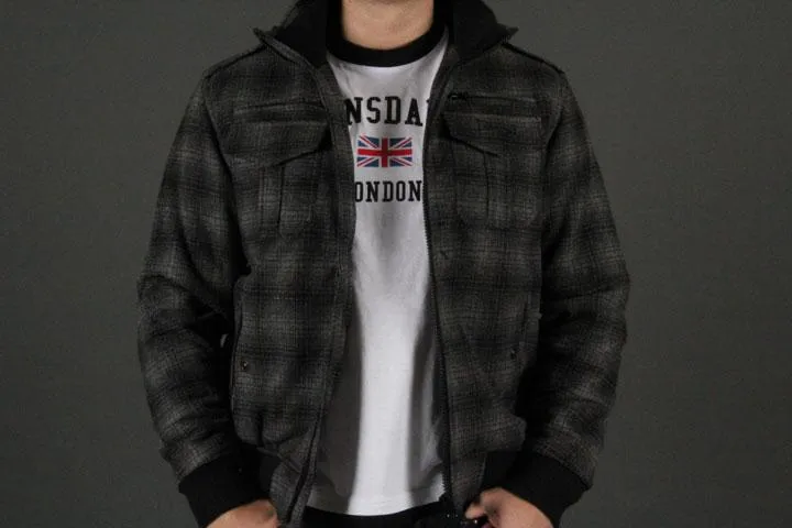 Lined jacket in a subtle plaid pattern with embroidery on the chest. Lonsdale + Lion embroidered at the top of the back. 4 front pockets + 2 inner pockets. Suitable as spring, fall and mild winter jacket. Outside: 40% cotton, 40% polyester, 20% viscose. Inside: 100% polyester. Lining: 100% polyester. Men's, gray, large.