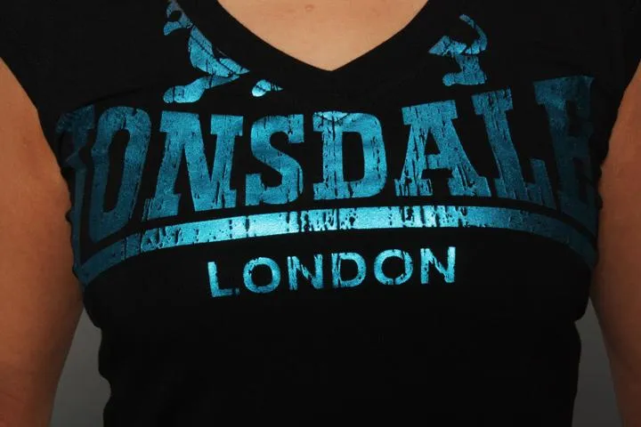 Best selling t-shirt for girls with large Lonsdale London print on the chest (Blue metallic foil broken print). Material: 95% cotton/ 2% elastane, 160 gr/m2. Ladies, black/blue metallic, XXL.
