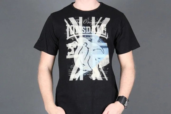 Regular size T-shirt, 100% cotton, Large print on chest, Ribbed around collar, Small lion embroidered on right sleeve, Small logo printed on back, black, XL.