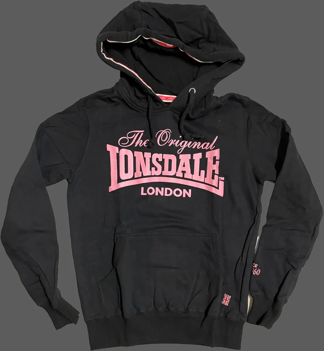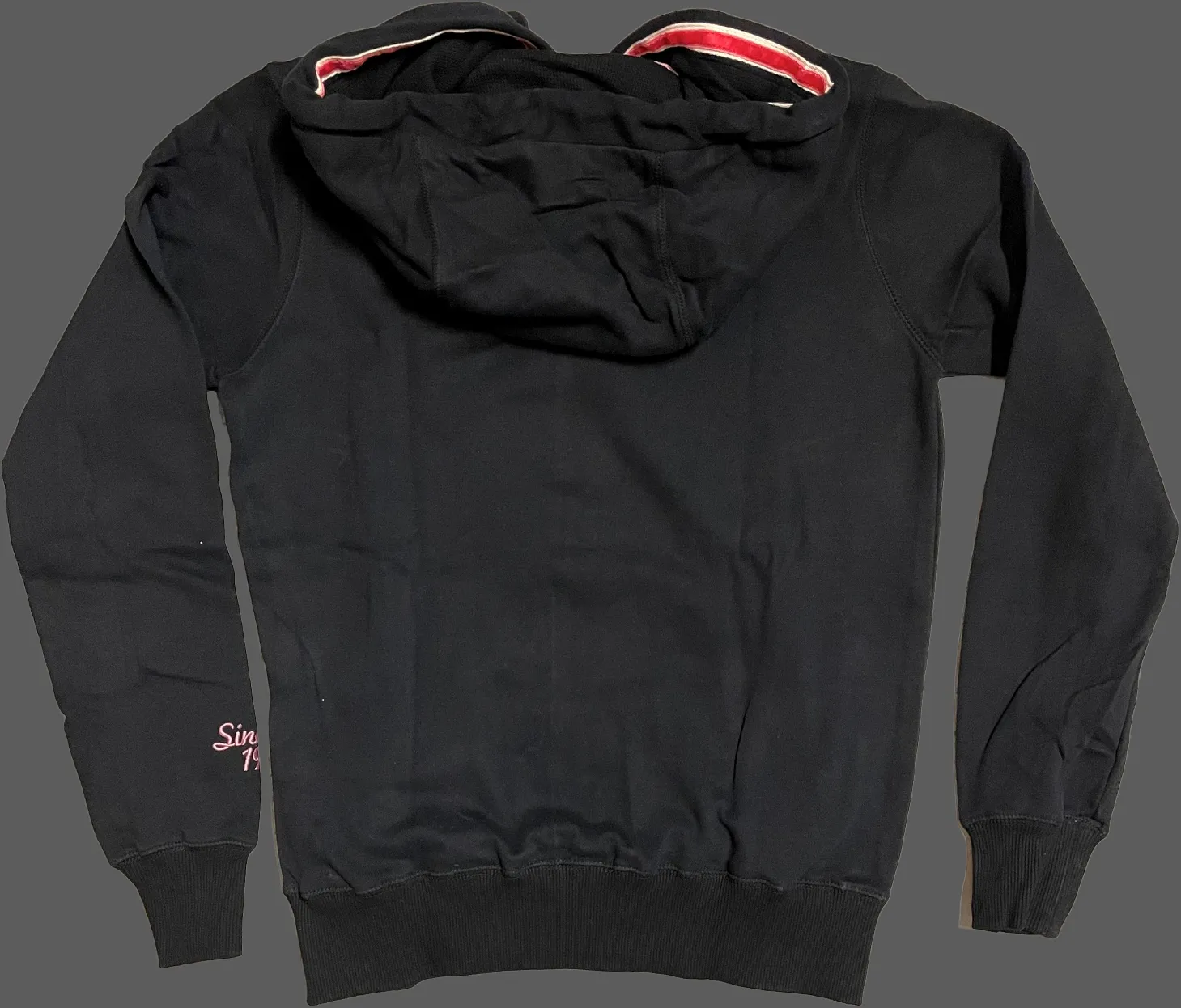 Hoodie, Velvet flock print combination, kangaroo pocket & black waffle lining in hood. 80% cotton, 20% polyester.Women's, black, medium.