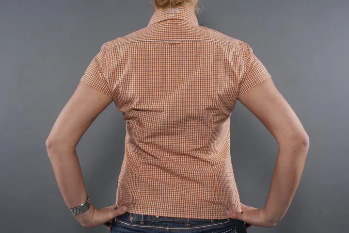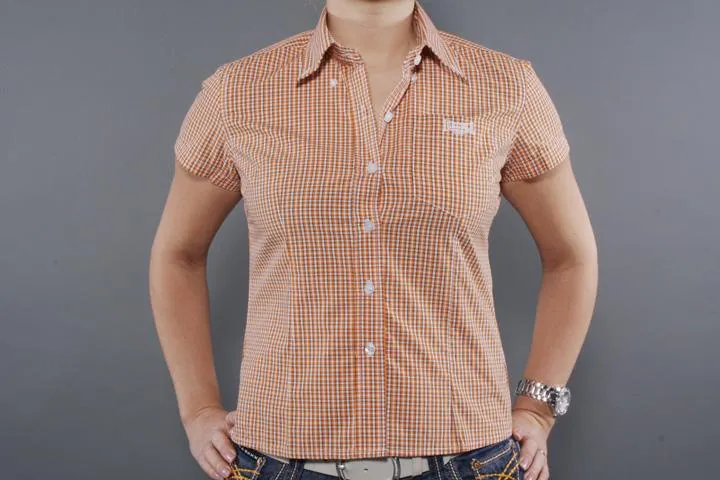 Chequered short-sleeved shirt with embroidered Londale logo on chest pocket and back collar. 55% cotton/55% polyester. Ladies, 8345 orange, Medium.
