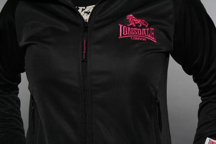 Stylish classic black zip trainer from Lonsdale with small pink embroidery on the chest. 100% polyester. Ladies, black, small.