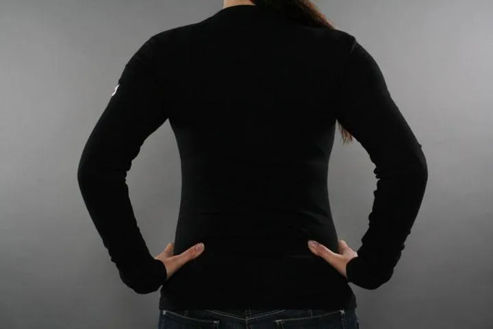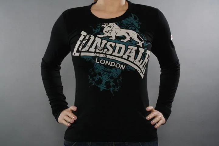 Long sleeve black Lonsdale t-shirt with large print on the chest. Small lonsdale badge on one sleeve. 9% cotton, 5% elastane. Ladies, black, small.