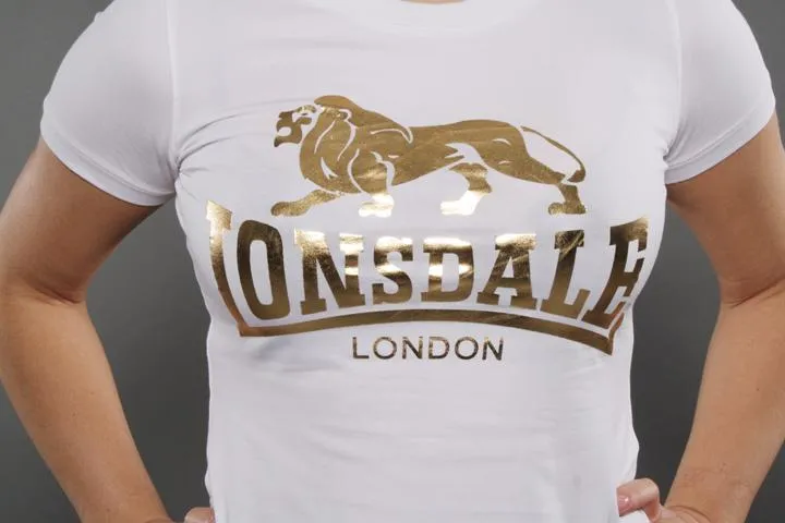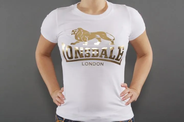 Stylish t-shirt for girls with large gold foil print on the front. Ladies, white, Large (40).