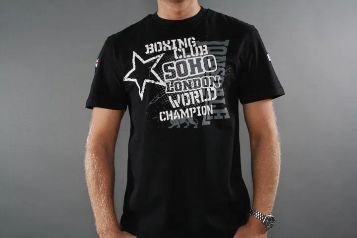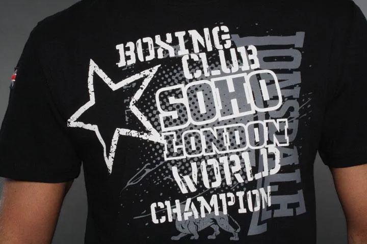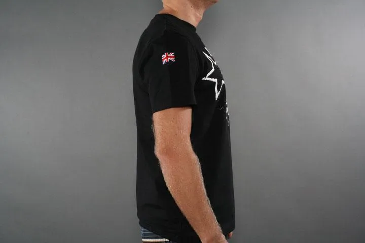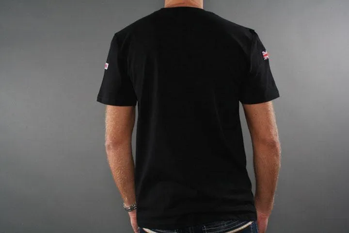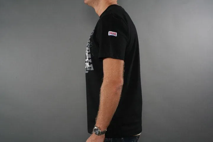 Short sleeve t-shirt with trendy print on the chest. Flag and Lonsdale badge on sleeves. 100% cotton. 180g/m2. Men's, black, large.