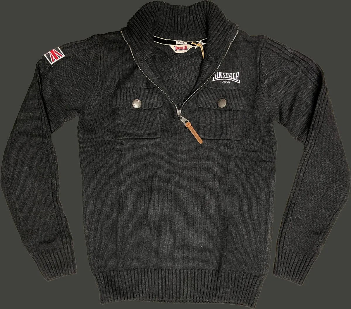 Stylish knitted pullover with short zipper in the tail. Embroidered Losndale logo on the chest and Union Jack badge on one sleeve. 2 front pockets. Men, gray, medium.