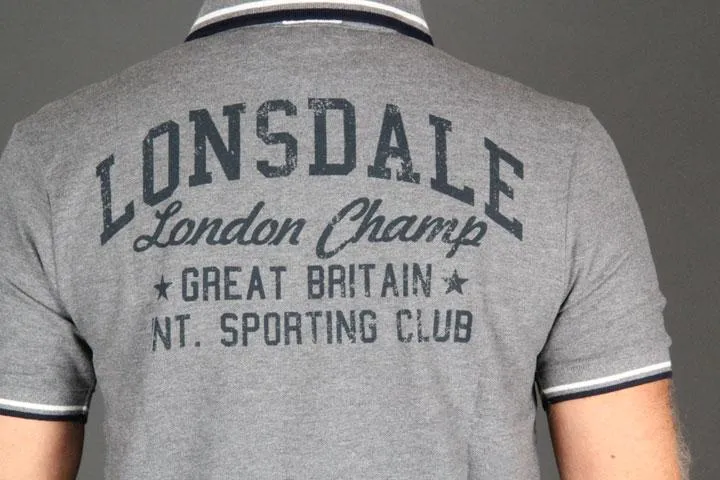 Slim fit polo, 100% cotton, Vintage faded print on back, Logo and lion embroidery on chest, Small vintage faded print on chest, Embroidery with UK flag on collar, Regular size, Men's, gray, small.