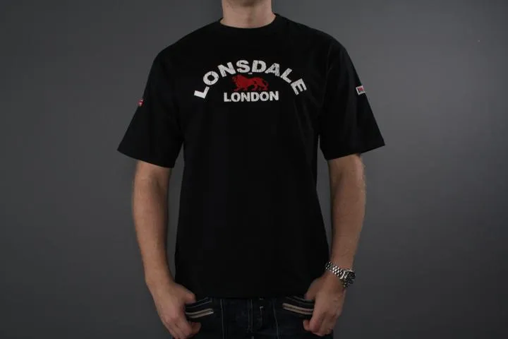 Short sleeve t-shirt with print on the chest. Small Lonsdale badge on one sleeve and Union jacket on the other. 100% cotton. Men's, black, XL.