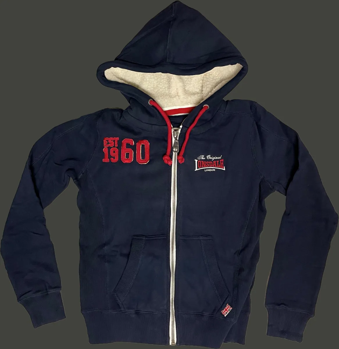Hoodie with zipper, The Original Lonsdale London embroidery on the chest, Est 1960 application on the other side of the chest, front pockets. Ladies, navy, large.