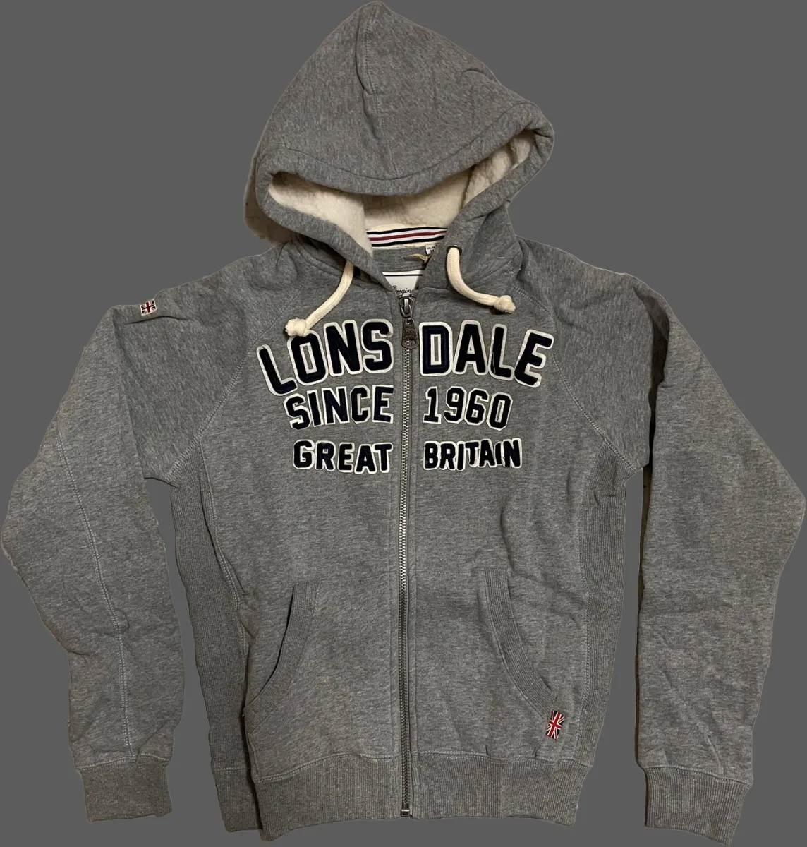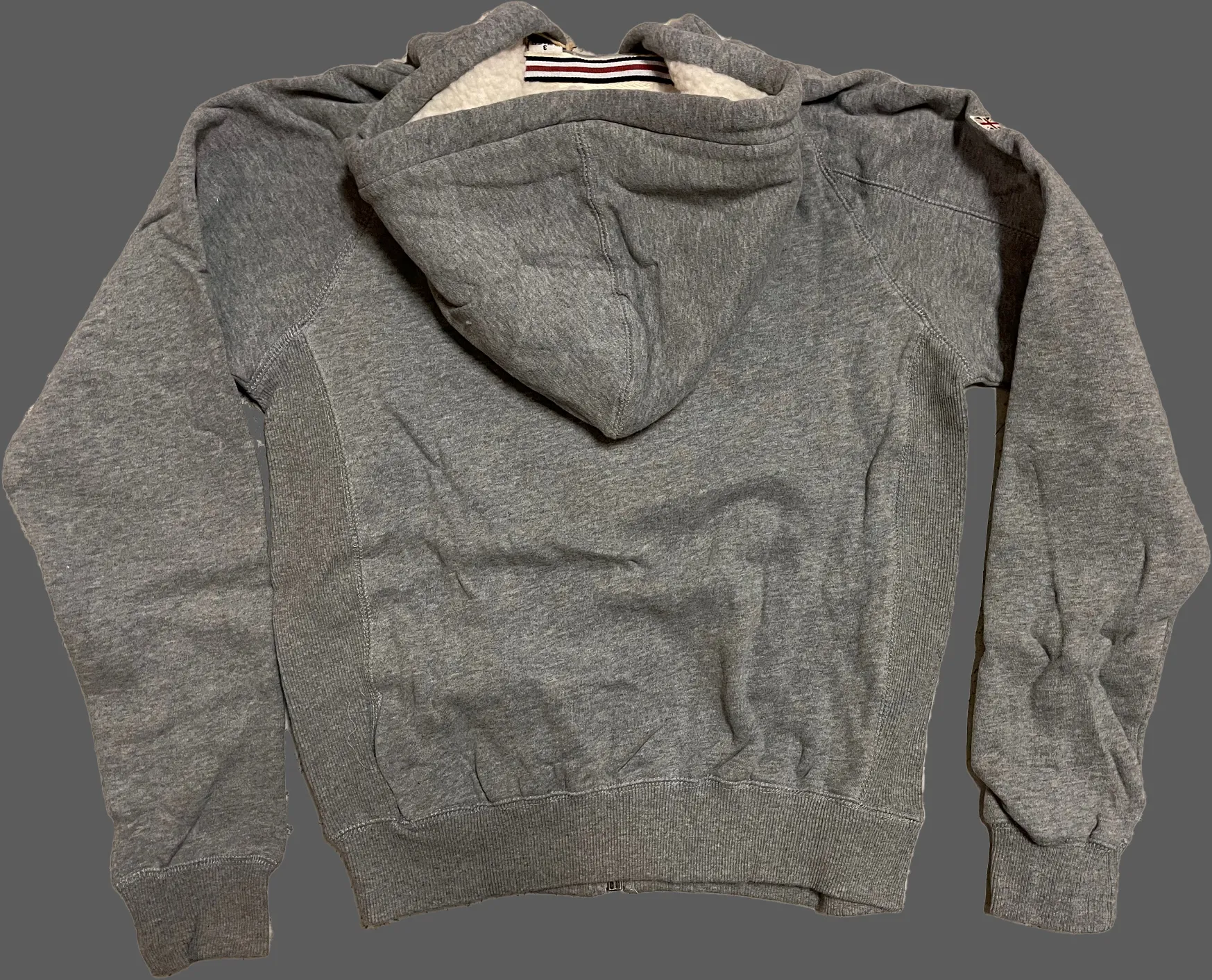 Hoodie with zipper. Double layer felt application, flag badge, kangaroo pocket & teddy lininge in hood. 80% cotton, 20% polyester. Women's, grey, medium.