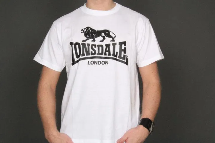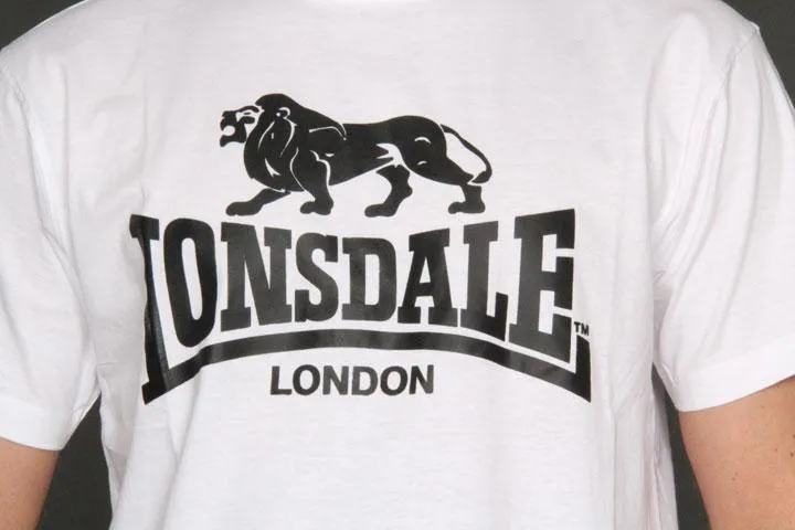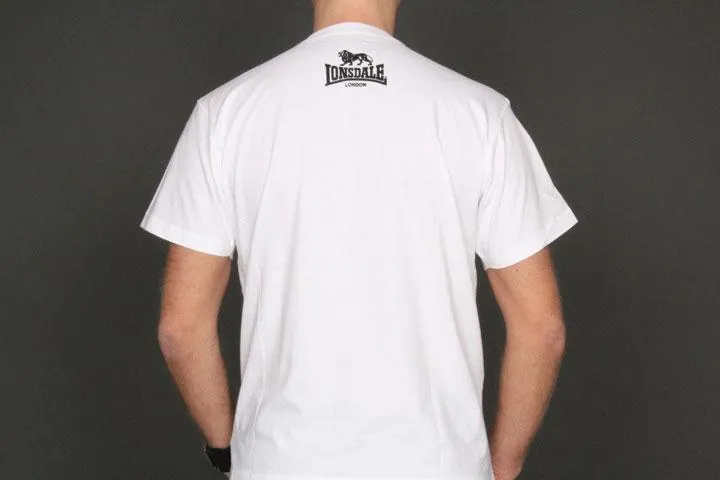White classic short sleeve t-shirt with print on the chest. Small Lonsdale print at the top of the neck on the back. 100% cotton. Men's, white, XS.