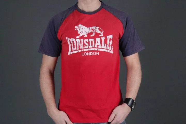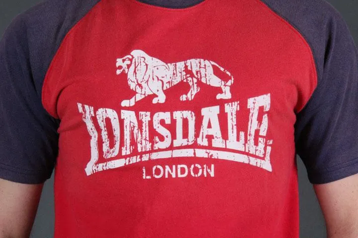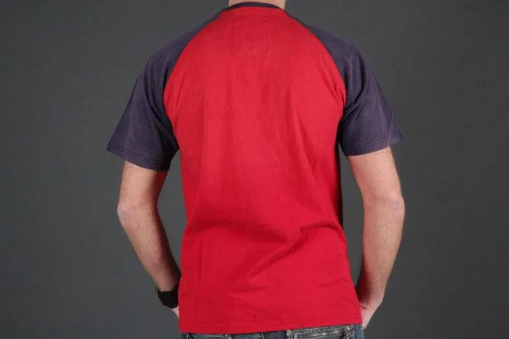 Two-tone t-shirt for men, Slim fit, 100% cotton, Soft stretchy material, Large, soft, and “broken” print on the chest, Normal size, red/navy, small.