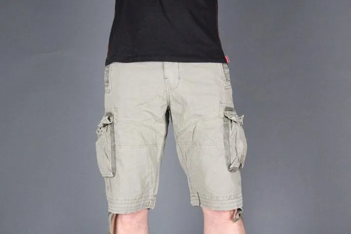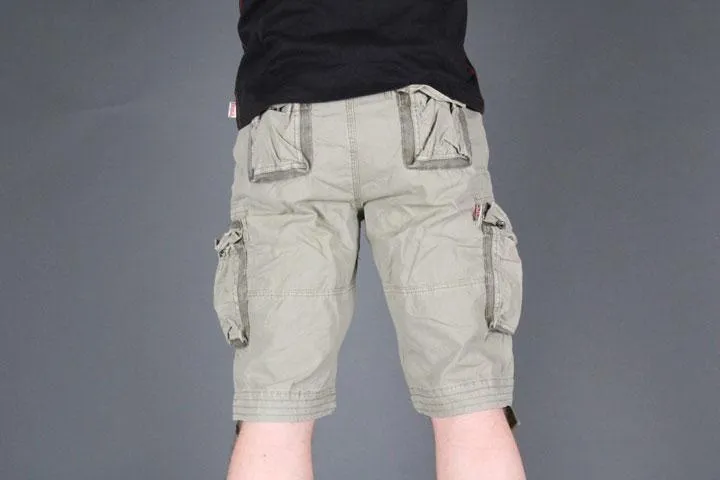 Trendy cargo shorts with front, side and back pockets. Button and zipper at the front. Small Lonsdale brand on one side pocket and Union Jack at the back waist. Men's, khaki, XXL.