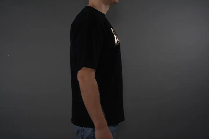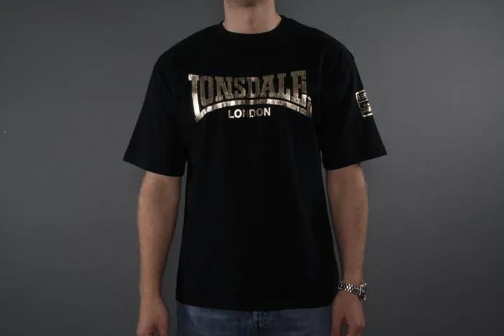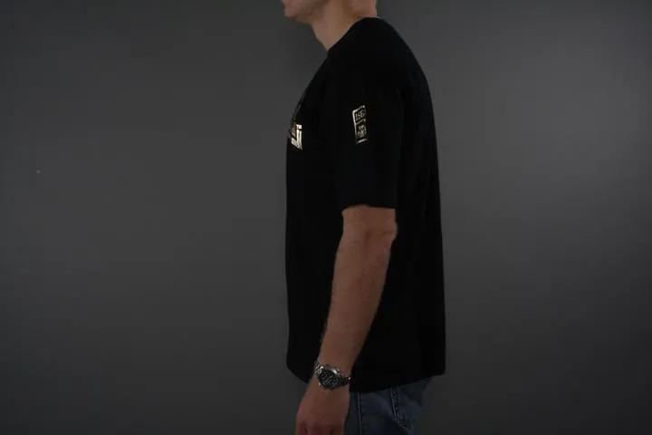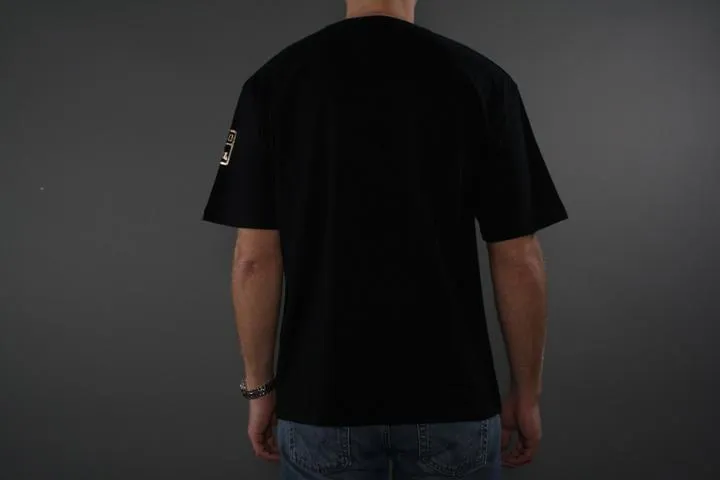 Black t-shirt with short sleeves. Gold print on chest and sleeve. 100% cotton. Washable inside out at 40 degrees. Men, black, XXL.