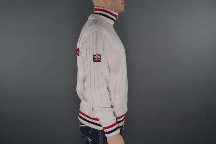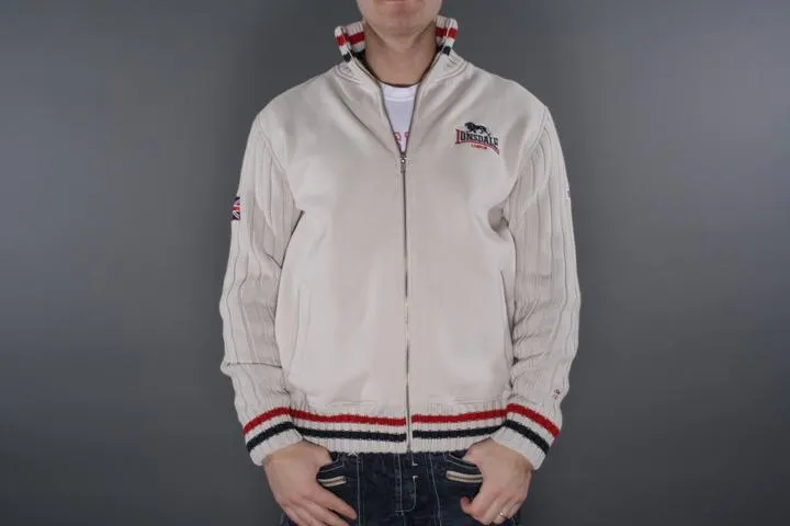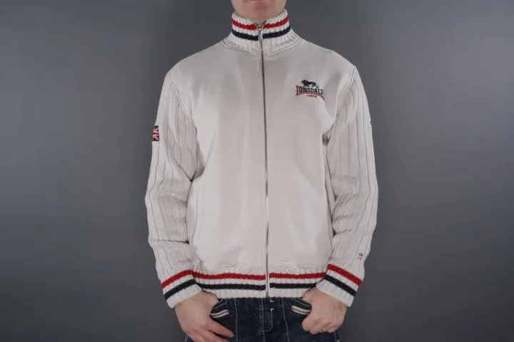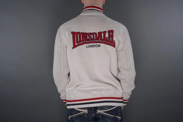 Zip up sweat with knitted sleeves. Embroidered Lonsdale logo on the chest and large embroidered logo on the back. The sleeves have extra fabric to protect against the wind. Perfect to wear under the vest. Men, Off White, Medium.
